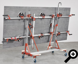Transportwagen für große Platten (z.B. 3200x1600x6 mm) und Transporthilfen und zum leichten Verteilen des Klebers auf der Rückseite der Platten.